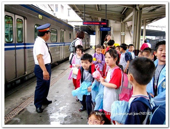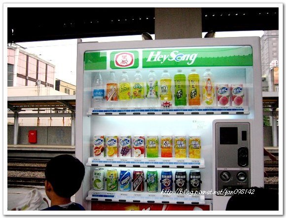 在車站月台有部販賣機,當老師、站長在介紹火車時